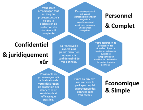 Le juriste expérimenté de la FFE établira pour vous une déclaration de protection des données individuelle répondant à toutes les exigences légales et adaptée individuellement à votre entreprise. Avec le forfait de protection des données à prix fixe, vous ne prenez aucun risque en matière de protection des données. Ce service est proposé en toute transparence des coûts.